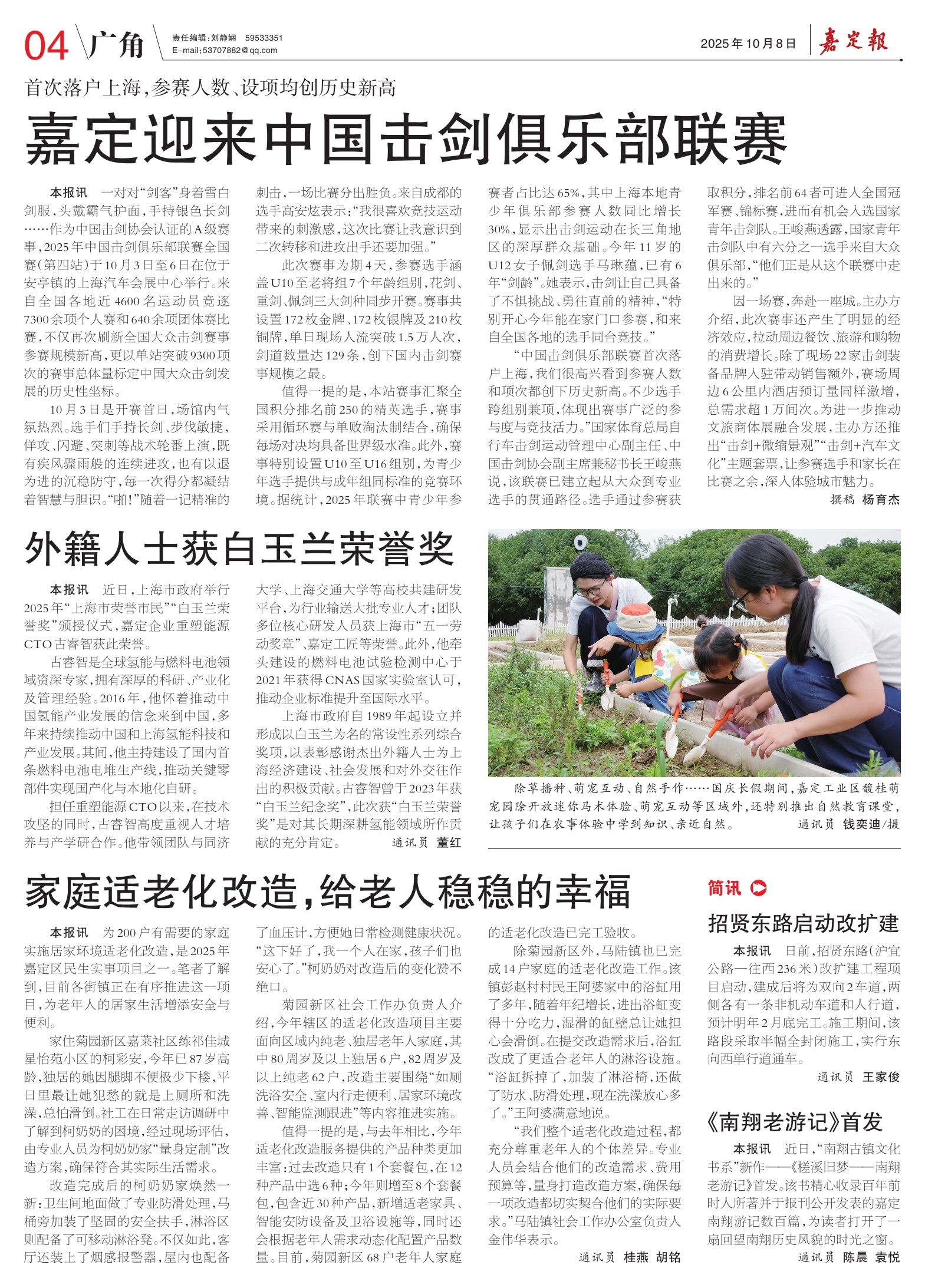 本报讯 一对对“剑客”身着雪白剑服,头戴霸气护面,手持银色长剑……作为中国击剑协会认证的A级赛事,2025年中国击剑俱乐部联赛全国赛(第四站)于10月3日至6日在位于安亭镇的上海汽车会展中心举行。来自全国各地近4600名运动员竞逐7300余项个人赛和640余项团体赛比赛,不仅再次刷新全国大众击剑赛事参赛规模新高,更以单站突破9300项次的赛事总体量标定中国大众击剑发展的历史性坐标。