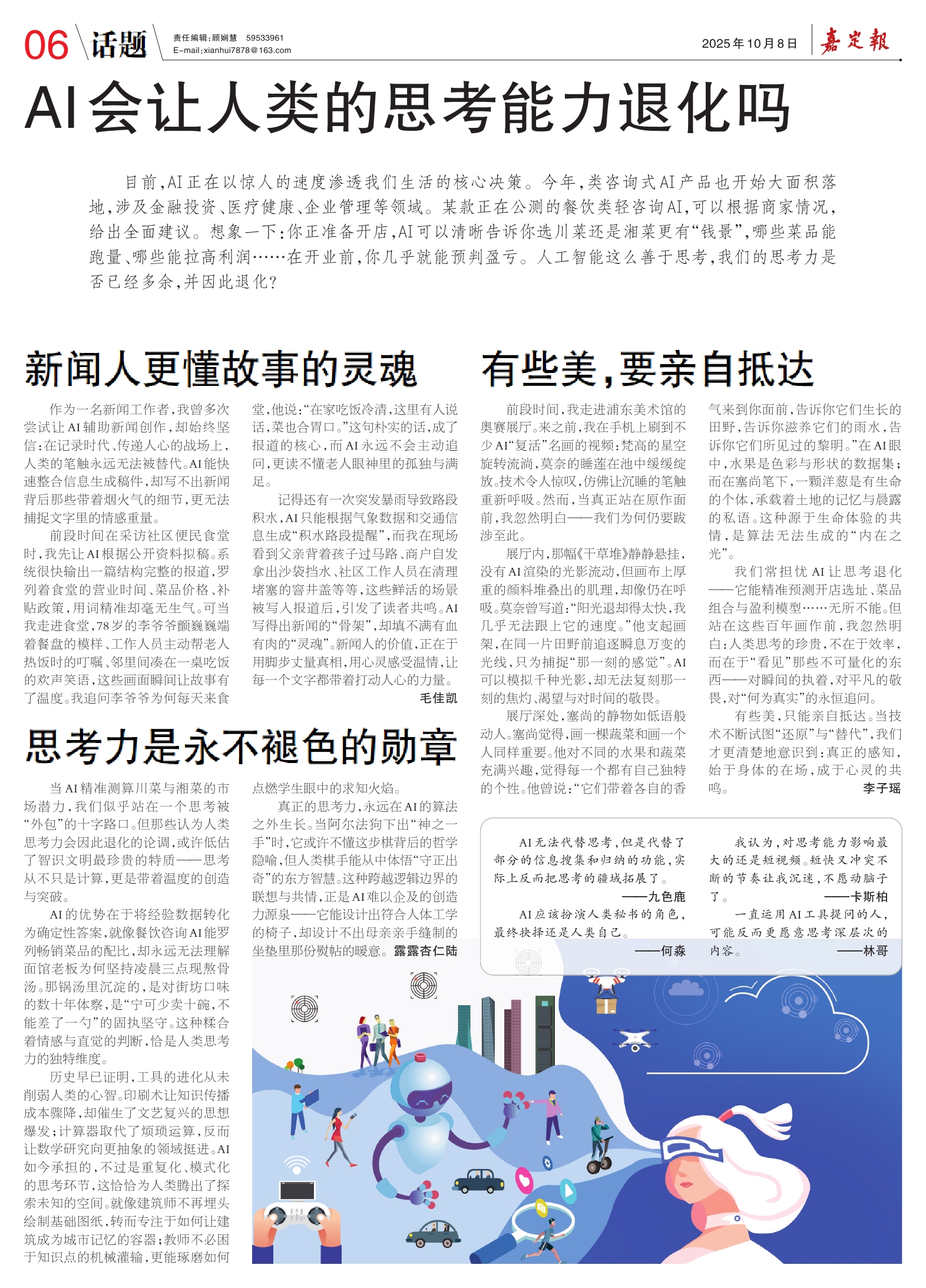 记得还有一次突发暴雨导致路段积水,AI只能根据气象数据和交通信息生成“积水路段提醒”,而我在现场看到父亲背着孩子过马路、商户自发拿出沙袋挡水、社区工作人员在清理堵塞的窨井盖等等,这些鲜活的场景被写入报道后,引发了读者共鸣。AI写得出新闻的“骨架”,却填不满有血有肉的“灵魂”。新闻人的价值,正在于用脚步丈量真相,用心灵感受温情,让每一个文字都带着打动人心的力量。