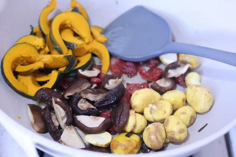 做法:1.锅中倒油,腊肠切片,煸炒出香味。2.倒入南瓜、干香菇、板栗翻炒均匀。3.倒入生抽老抽、蚝油,根据口味加入盐糖调味。4.米淘洗干净,将炒好的料平铺在米上,倒入适量清水,按煮饭键即可完成。